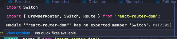 Module '"react-router-dom"' has no exported member 'Switch'.ts(2305)- 위와 같은 오류 발생 시, 아래와 같이 코드 수정