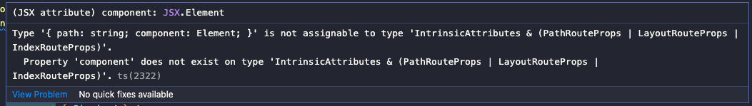 Type '{ path: string; component: Element; }' is not assignable to type 'IntrinsicAttributes & (PathRouteProps | LayoutRouteProps | IndexRouteProps)'. Property 'component' does not exist on type 'IntrinsicAttributes & (PathRouteProps | LayoutRouteProps | IndexRouteProps)'.ts(2322)