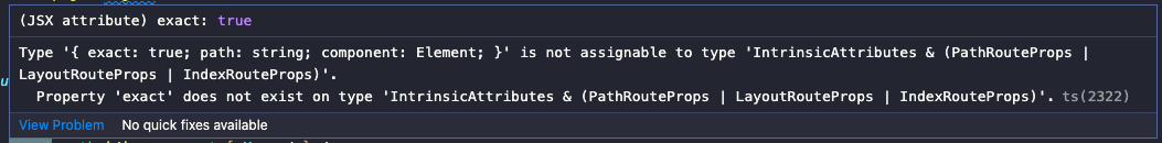 Type '{ exact: true; path: string; component: Element; }' is not assignable to type 'IntrinsicAttributes & (PathRouteProps | LayoutRouteProps | IndexRouteProps)'. Property 'exact' does not exist on type 'IntrinsicAttributes & (PathRouteProps | LayoutRouteProps | IndexRouteProps)'.ts(2322)