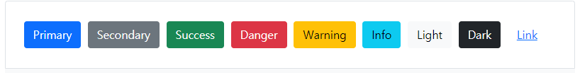 <button type="button" class="btn btn-primary">Primary</button> <button type="button" class="btn btn-secondary">Secondary</button> <button type="button" class="btn btn-success">Success</button> <button type="button" class="btn btn-danger">Danger</button> <button type="button" class="btn btn-warning">Warning</button> <button type="button" class="btn btn-info">Info</button> <button type="button" class="btn btn-light">Light</button> <button type="button" class="btn btn-dark">Dark</button> <button type="button" class="btn btn-link">Link</button>