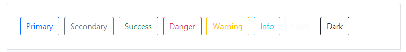 <button type="button" class="btn btn-outline-primary">Primary</button> <button type="button" class="btn btn-outline-secondary">Secondary</button> <button type="button" class="btn btn-outline-success">Success</button> <button type="button" class="btn btn-outline-danger">Danger</button> <button type="button" class="btn btn-outline-warning">Warning</button> <button type="button" class="btn btn-outline-info">Info</button> <button type="button" class="btn btn-outline-light">Light</button> <button type="button" class="btn btn-outline-dark">Dark</button>
