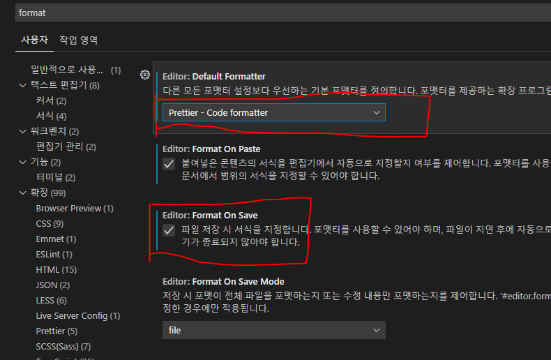 - 파일 저장 시, Prettier 설정 적용되도록 Editor: Format On Save 설정 클릭
